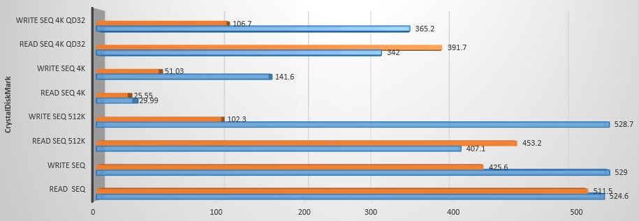 As you saw in the legend in the first screen, orange represents the Samsung SSD and blue represents the Patriot SSD. While the Samsung did outperform the Patriot in some, over all the Patriot drive outperformed the Samsung drive. The 4K Read and Write were better, Write was almost triple on the Patriot drive and again Sequential read and write speeds were higher on the Patriot.
