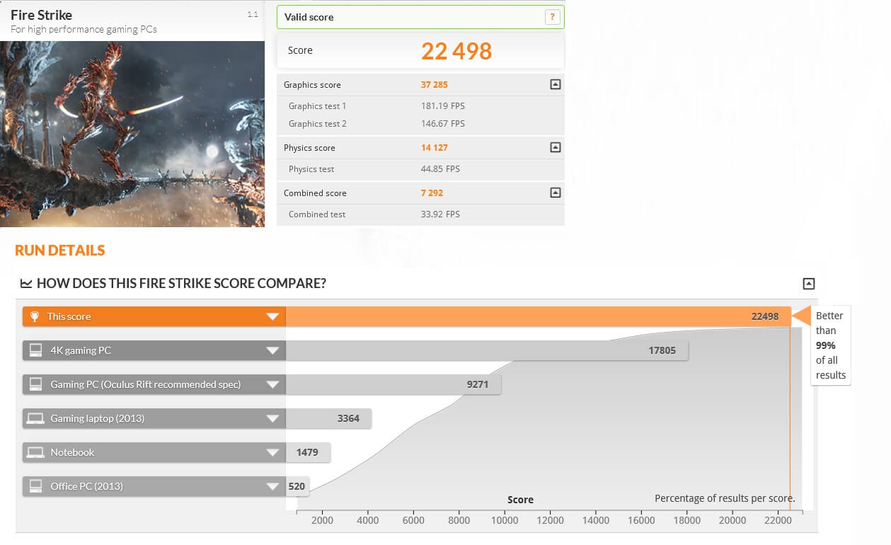 For your reference, here is 3DMarks output, you can see here this machine scored 99% better than all other results, very impressive. Here are the scores on my machine. It did 86% better than all other results, not bad at all, it can hold its own but you can see the performance difference is almost night and day.