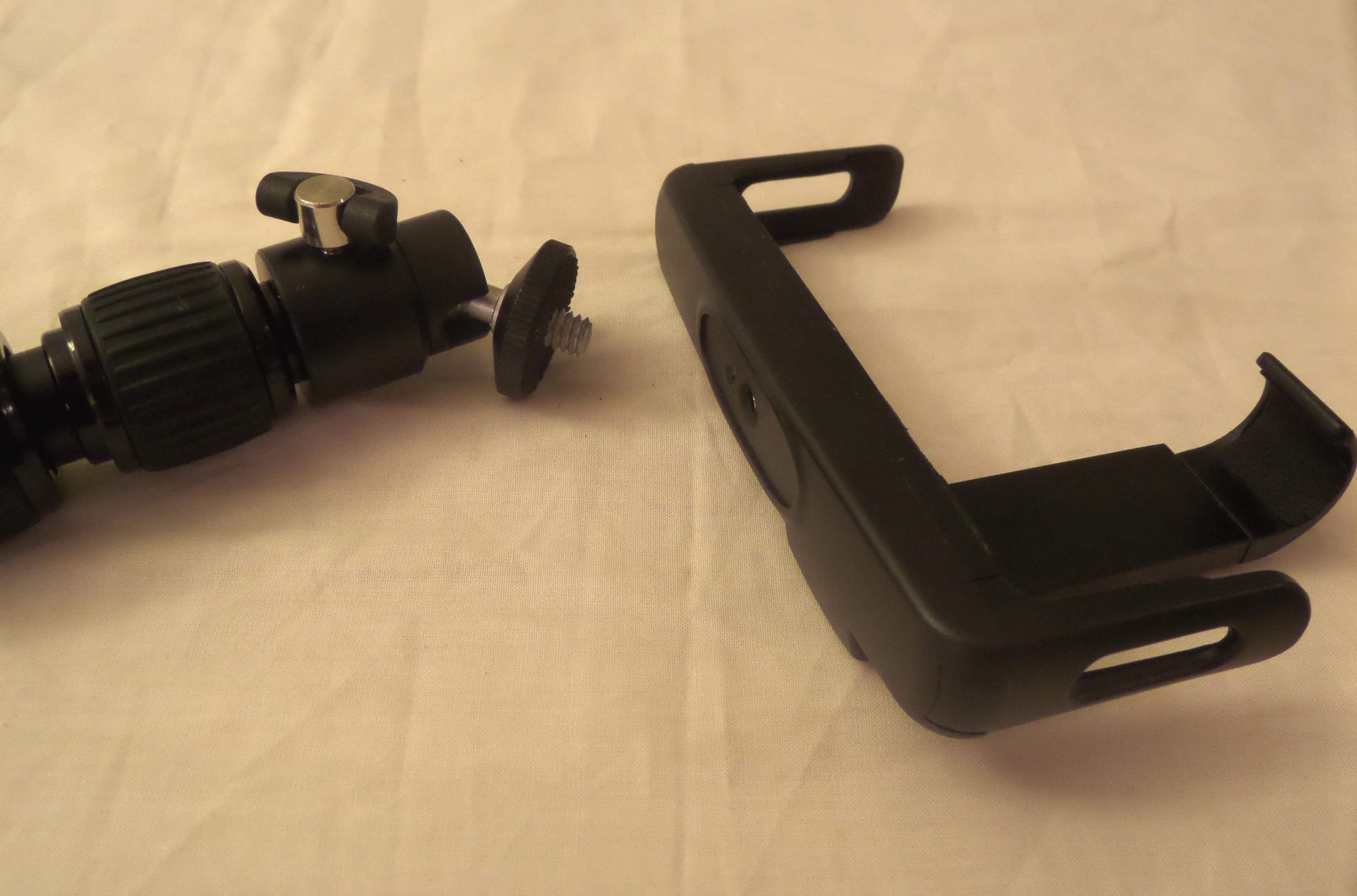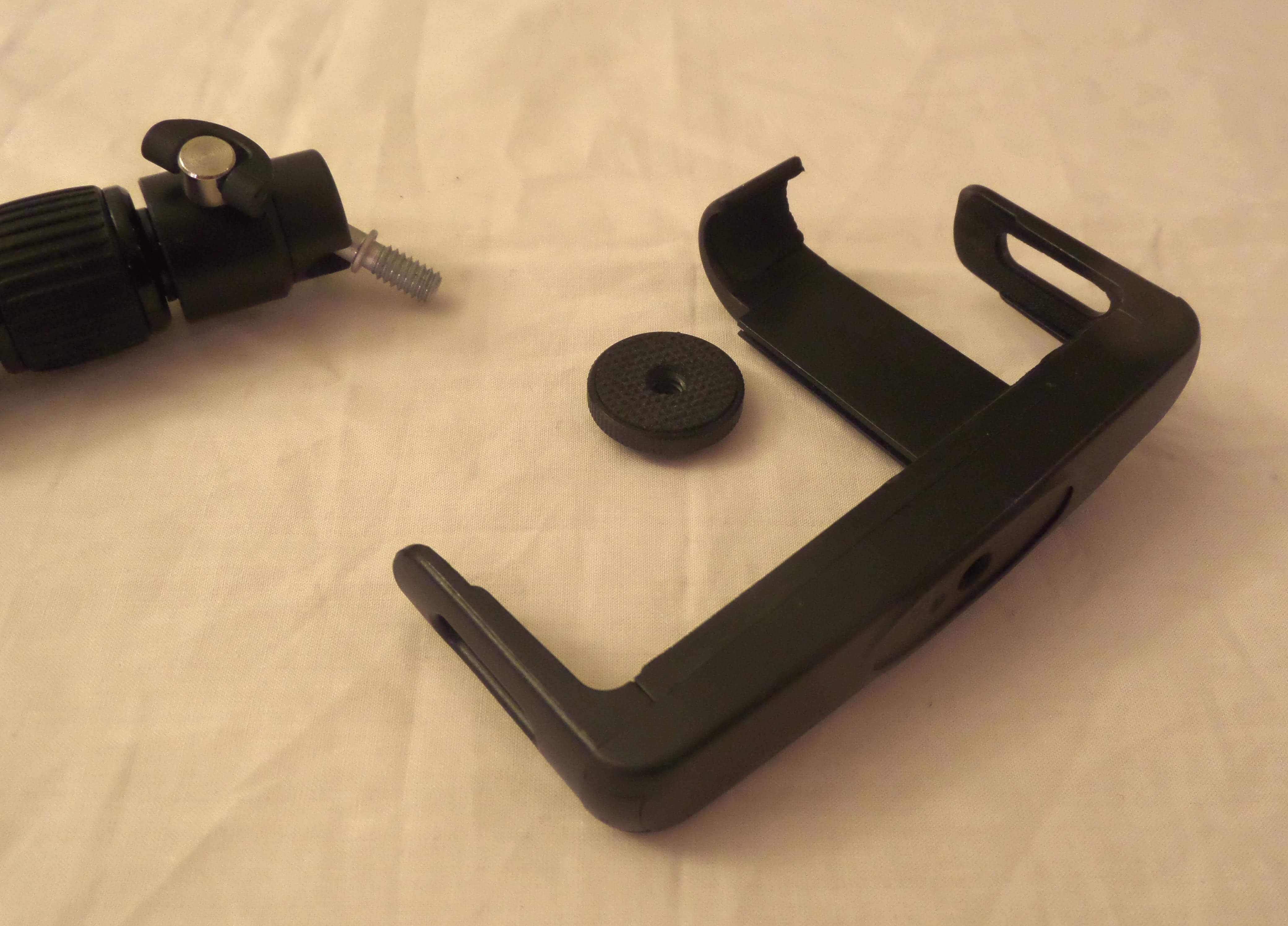 Here is a picture of the top end of the selfie-stick and a little quarter sized spacer and the holder for Cell phones.