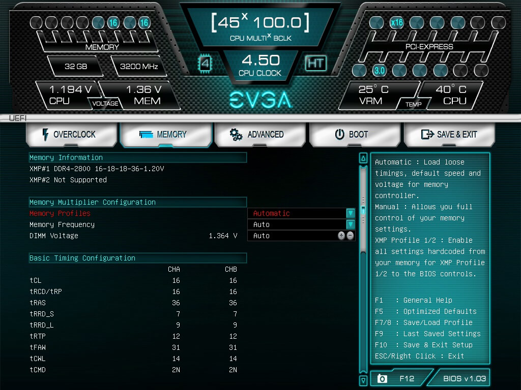 At 3200Mhz, I was able to keep everything the same, but in order to get the PC stable and able to boot, I had to raise the voltages a bit. XMP states the memory is at 1.20V but is you notice, the automatic Voltage timer read 1.364, so I raised it from auto to 1.350, to see if I could undercut it a bit and it worked fine.