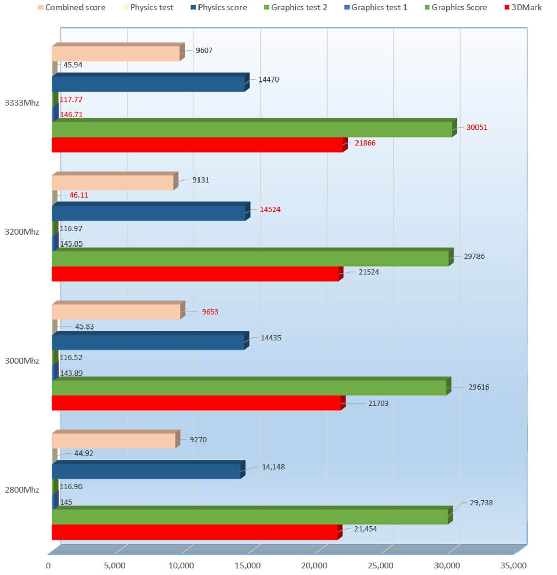 Here we can see all 4 speeds compared, as you might have though, 3333Mhz performed the best on the 3DMark score, but going a bit deeper, we can see all the scores were not improved. While 3333Mhz rose above the rest in the basic score, it came above the rest as well in the Graphics score, Graphics test 1 and 2, 3200Mhz actually performed best overall in the Physics score and the Physics test but then the crown goes to 3000Mhz in the combined score coming in at 9653.