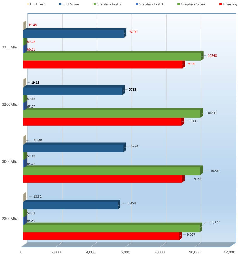 Performance was split across 3333 for 3DMark score, Graphics Score and both graphics test, 3200Mhz performed best in Physics score and Physics test and 3000Mhz came in best in the combined score. 3333Mhz, while not the best overall, brought in some solid performance. Let’s see what this means to Time Spy.