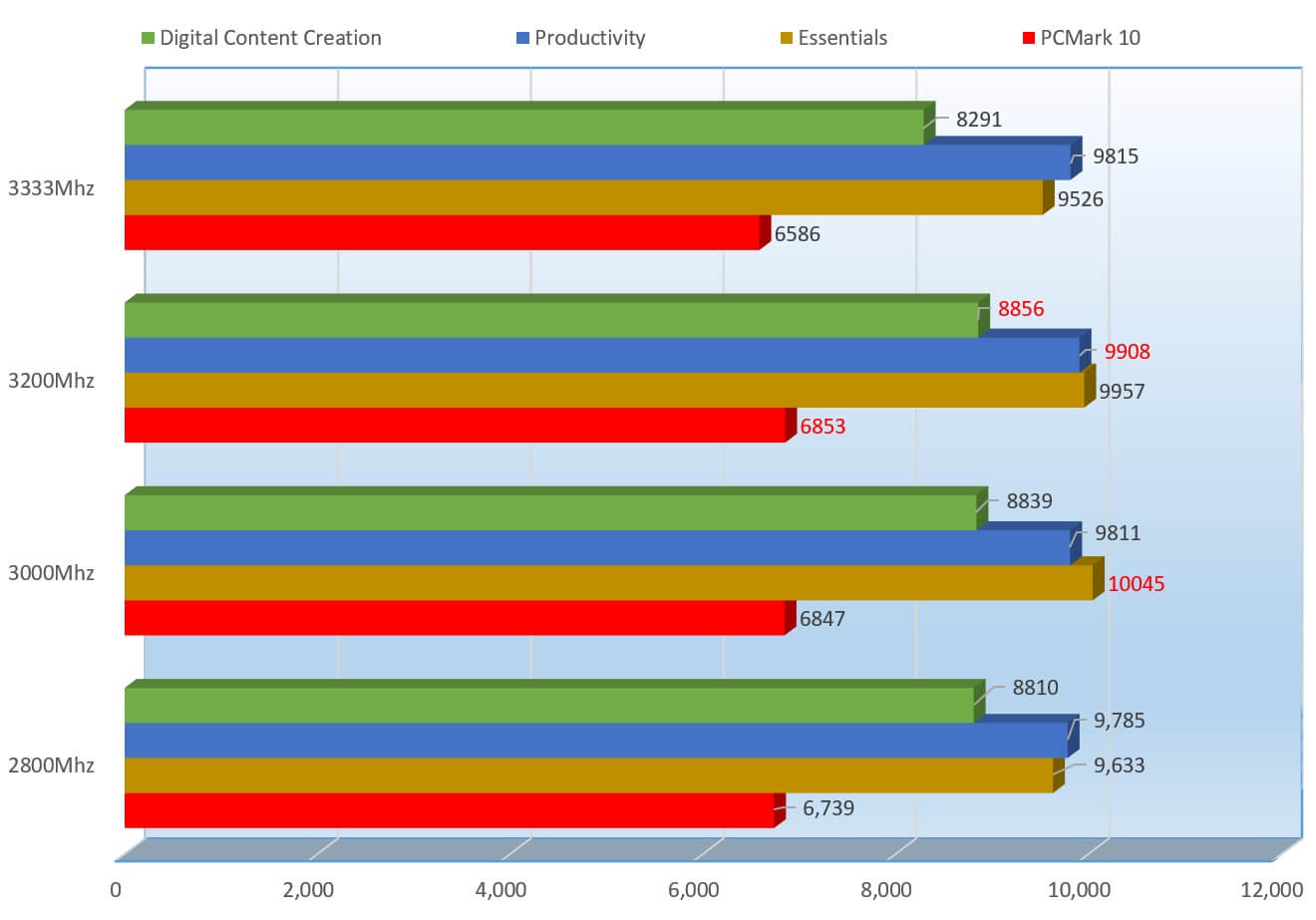 It looks like the scores were scattered here as well, but this time not in favor of the 3333Mhz setting, actually none of the highest scores were part of the 3333Mhz setting. Writing Score, Productivity and PCMark 10 favored 3200Mhz, but the Essentials Score scored highest on the 3000Mhz.
