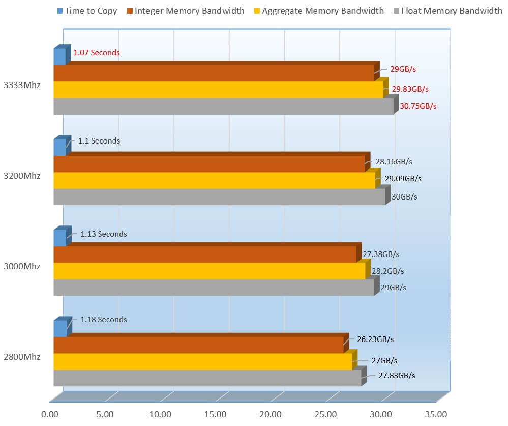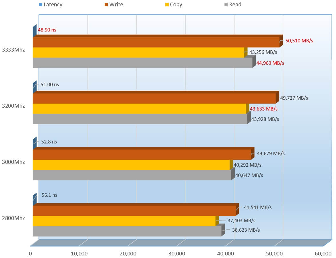 3333Mhz did a great job here, coming up on top in the Write and Read speeds, but fell slightly short on the Copy speeds which is a bit disappointing. Now the great part is the latency was 2.1 nano seconds shorter than the rest which is great, no one wants to wait a long time.