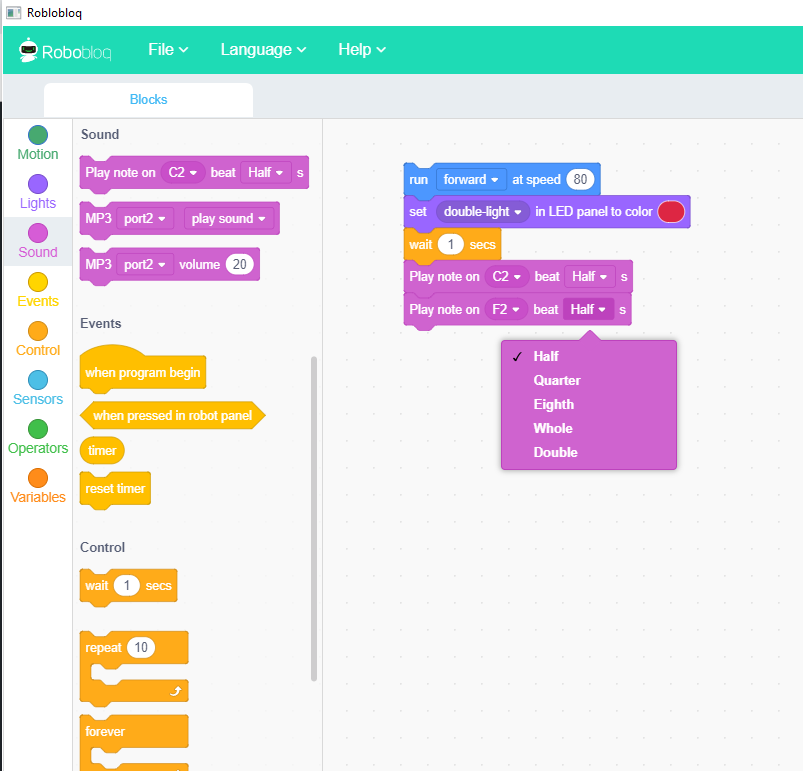 You can get pretty complex though even syncing the lights to blink with sounds, or movement to trigger with notes…etc. Let your kids explore what complicated programs they can think of and you can save their programs as .bloq files or import/load .bloq files. Really the sky’s the limit with the provided sensors and functions you have with the Q-Scout and if your child really likes the Q-Scout and gets it down you can upgrade to the more advanced robotics modules later.
