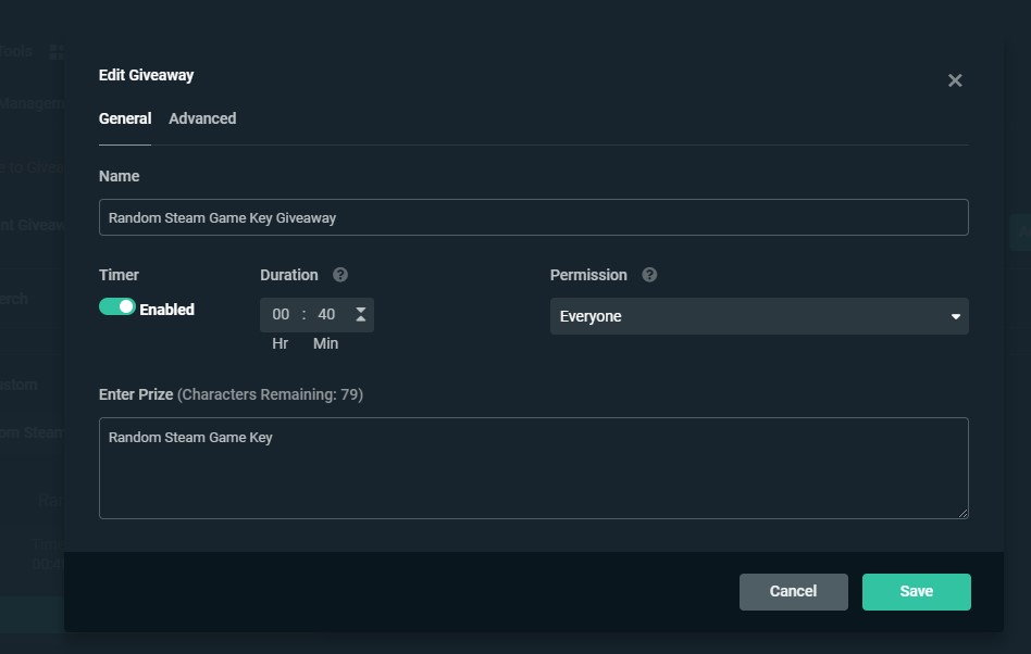Click on the advanced tab of Edit Giveaway and you will see more options for controlling the SLOBS Cloudbot giveaway.,