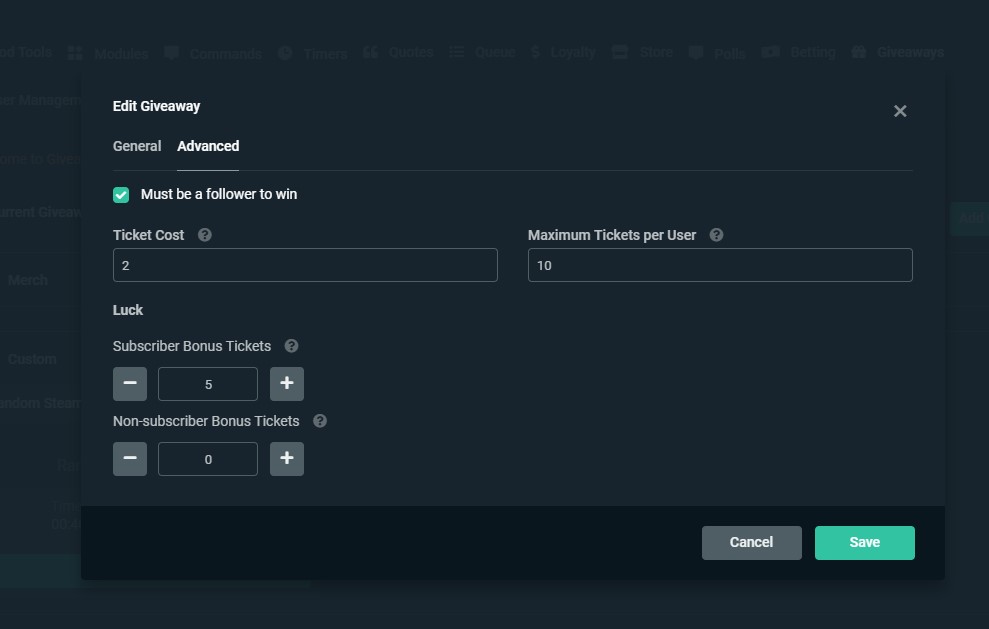 One thing you can do here is also give a bonus ticket count to subscribers, this I also do as an added incentive for someone to become a subscriber and also allow a subscriber to have a odds fighting chance against a non-subscriber who just accrued hundreds of points from watching. So I give a bonus 5 tickets for subs so that if the max is 10 tickets, they will have 15 tickets in the giveaway. You can also give non-subscriber bonus tickets just for entering, but not sure why you would do that unless you wanted to give them an incentive to join the giveaway and for select giveaways offer bonus ticket entries.