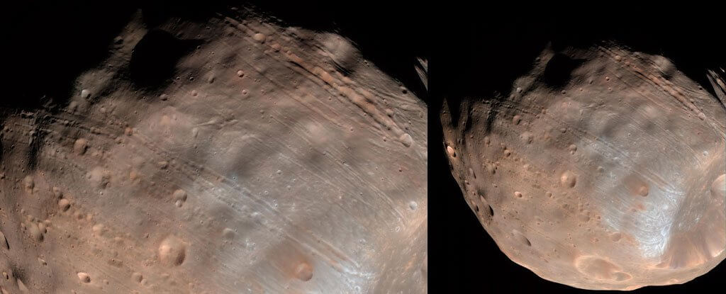 If the Phobos were made of a core of rubble or debris instead of solid rock, it would get deformed much more easily over millions of years! Plus, the surface could be rocky making it seem as if the entire celestial body was rocky. It could just be like a nut – hard outside, soft inside. The constant pulling by Mars would cause sections of the satellite to get separated or stretched, thus developing these grooves.