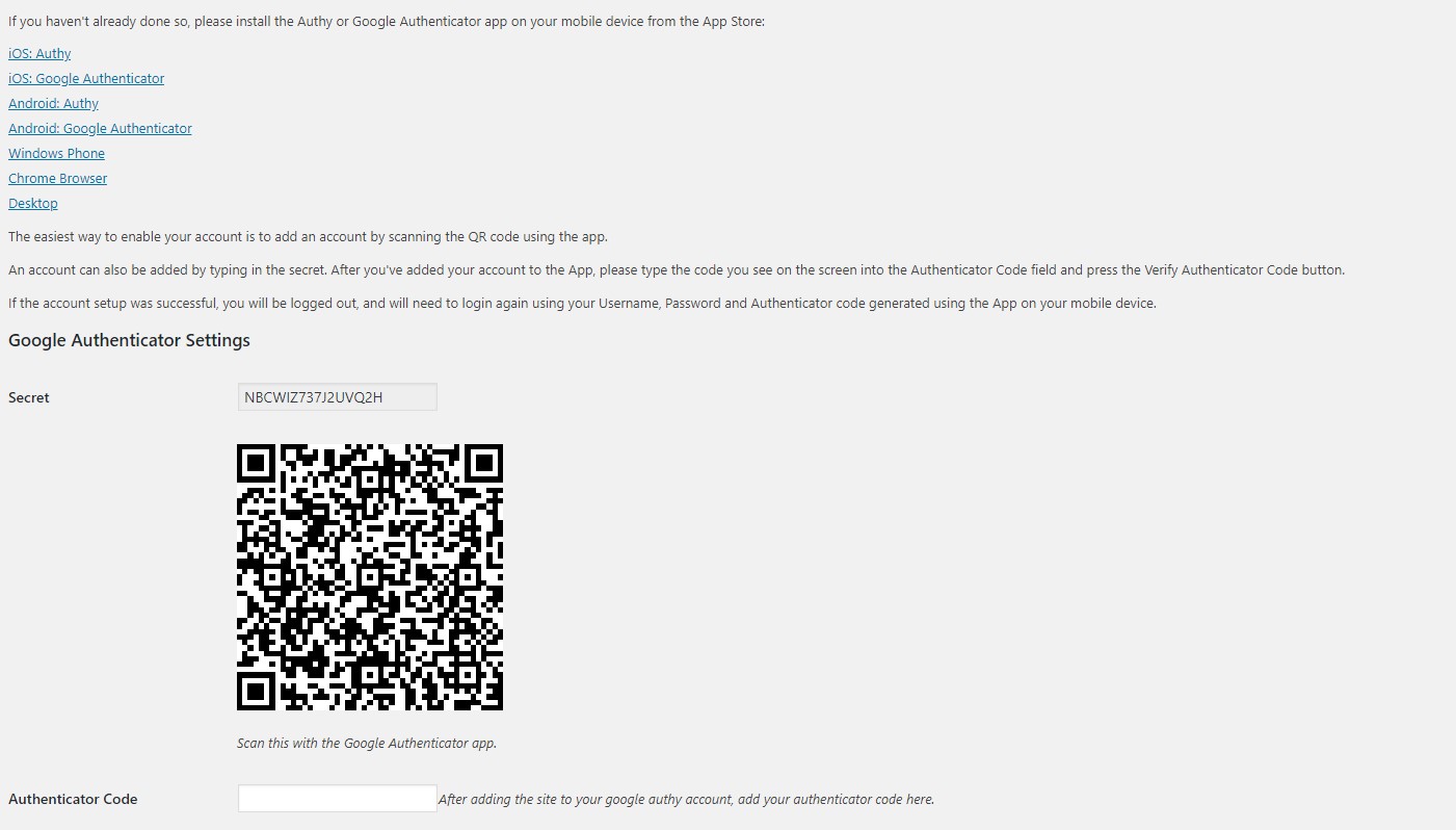 After you select your role and save, you will see a QR code that you can scan with your Google Authenticator or Authy app and then you will now be given a rotating code you can use to sign into your WordPress site.