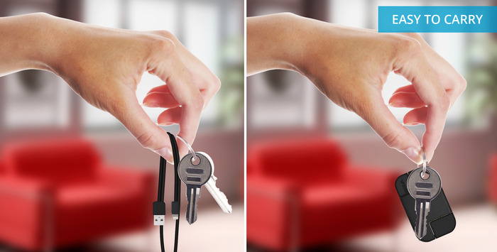 Along with inbuilt support for the latest iOS 8, the USP or highlight of this one in several (practically countless) PC to Mobile device connectors is that IT IS A KEYCHAIN! Just put it in your pocket or wallet with car/office/house keys attached ;-)