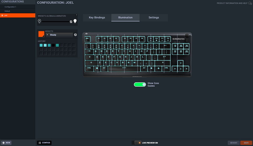 This keyboard can also be easily customized, for example, you can use the default lighting modes or get full customization through the free software “SteelSeries GG”. It’s a bit strange that the box didn’t mention anything about the instructions to download the software, in fact I discovered it after looking it up on the internet. To adjust the intensity of the lights, you can press the “Steelseries” function and F11 or F12 keys.