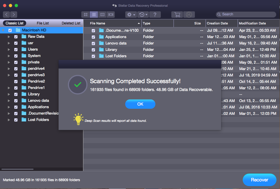 After the scanning process is finished, a popup will appear showing how much data can be recovered from your Mac. For me, the software was able to recover 48.96GB of data.