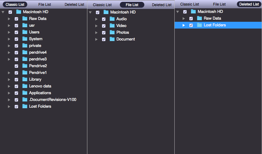 Now there are three ways to preview the recovered data. Classic List shows the files as they are found in the hard drive. The File List shows the recovered files according to their data types such as Audio, Video, Photos, and Documents. Finally, the Deleted List shows you the Raw Data and Lost Folders. There is also a Search Bar on the top right which lets you search for any specific deleted file which is quite useful.
