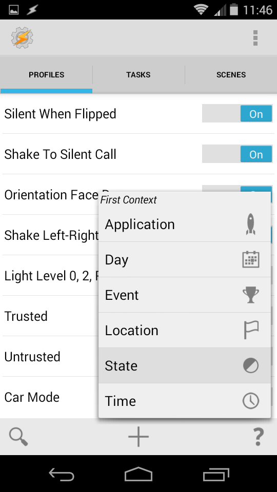 Then select a context for your profile, it can be anything (App, Day, Event, Location, State, Time). In this post, I will make a profile to silent my phone when I flip it upside down when it is ringing.