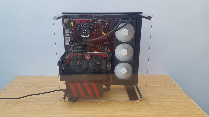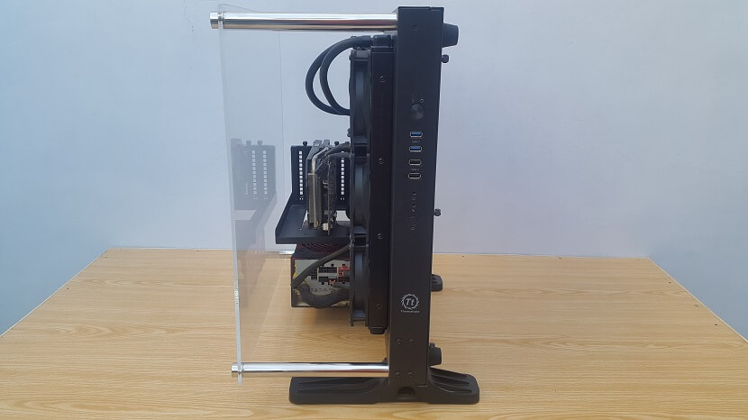 So let’s start the review with little details about the chassis and go deeper as we proceed. The Thermaltake Core P3 is a mid-tower chassis that supports standard ATX, ITX, and MATX motherboards and can hold a 420mm radiator and a reservoir on the right side.