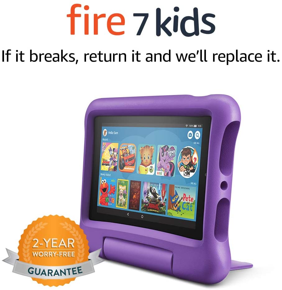 Fire 7 Kids Tablet includes a Kid-Proof Case with built-in stand, 1-year of Amazon Kids+, and a 2-year worry-free guarantee. You can save up to $89 on a Fire 7 Tablet (not a toy) for kids ages 3-7, 1 year of Amazon Kids+, a Kid-Proof Case with built-in stand, and 2-year worry-free guarantee, versus items purchased separately. The Kid-Proof Case is designed to protect against drops and bumps with a perfect fit in hands—or enjoy hands-free with the built-in stand. Plus, Fire Kids tablets include a 2-year worry-free guarantee. If it breaks, you can contact Amazon and they will replace it for free.