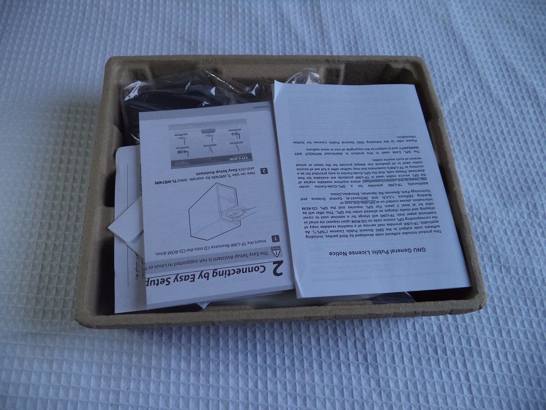 After removing the manuals and driver CD, you can have a better look at the router itself and its adapter. They were the only two thing in place to be honest.
