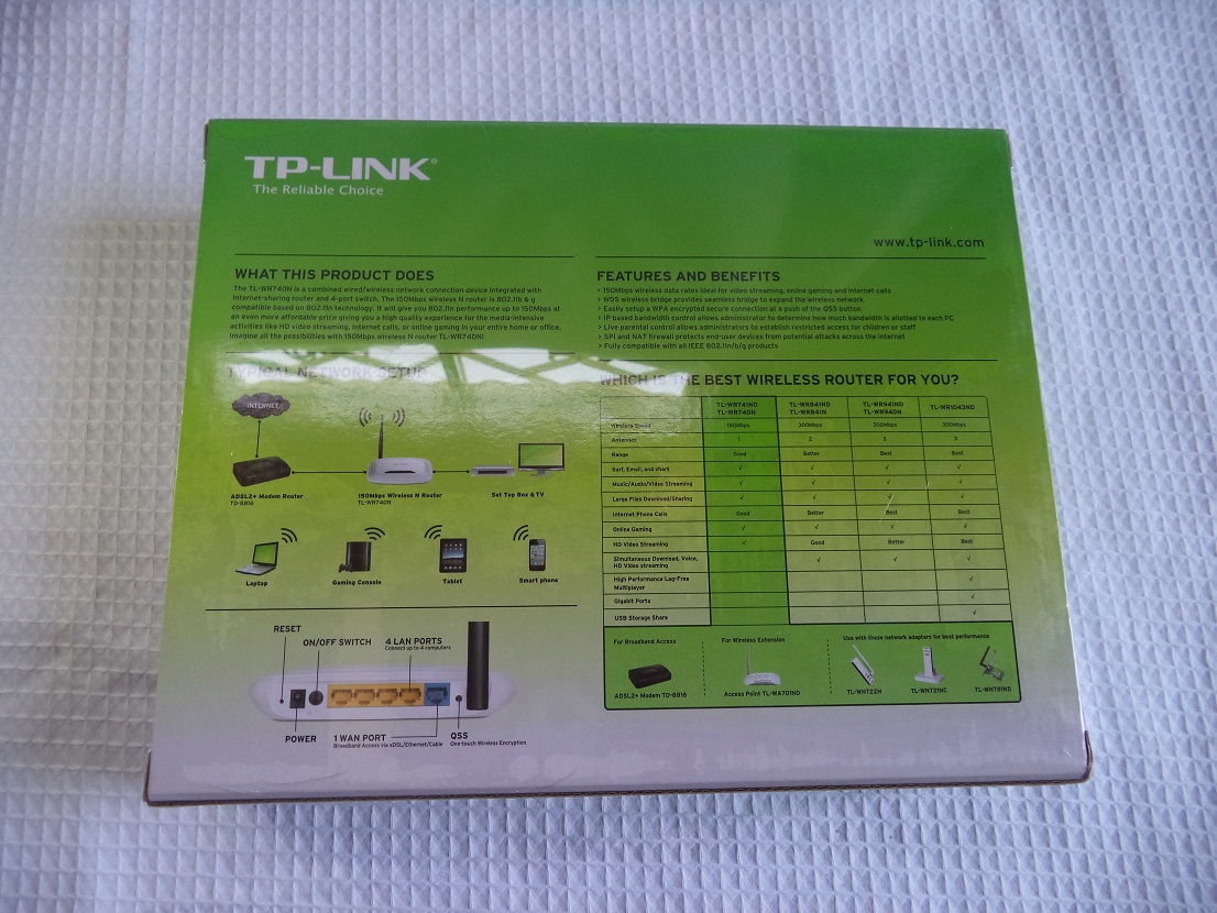 On the back of the box, we have a detailed comparison table of products from TP-Link’s TL-WR line up. We can see our router highlighted in the second column of the table. Above the table there are some written benefits and features about the product like data transfer rate, IEEE 802.11n/b/g compatible, firewalls etc.
