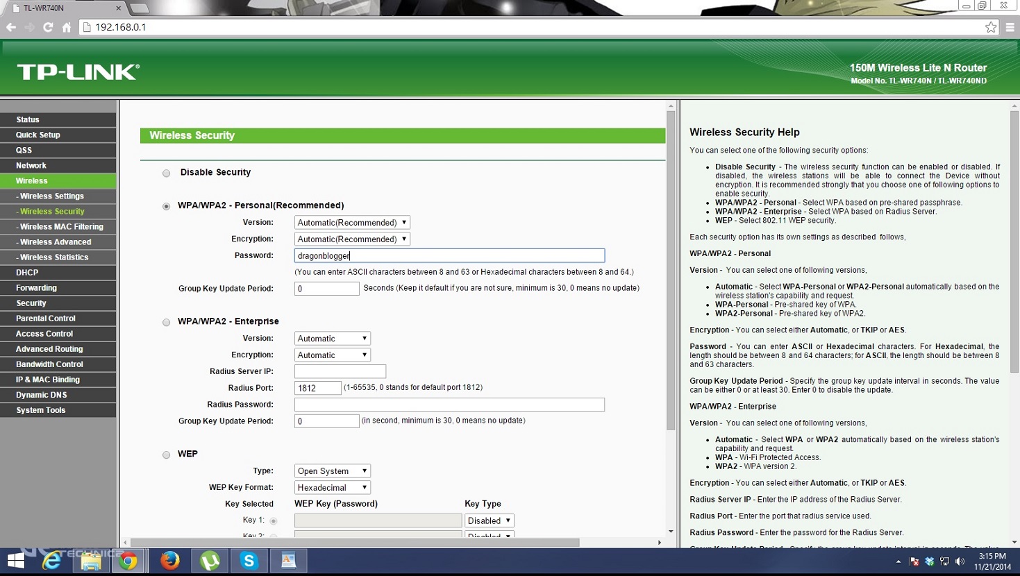 To change the password for your wireless connection, go to Wireless>Wireless Security. It’s up to you, which kind of protection/encryption method you select, but since WPA/WPA2 is recommend, I’ll go with that.