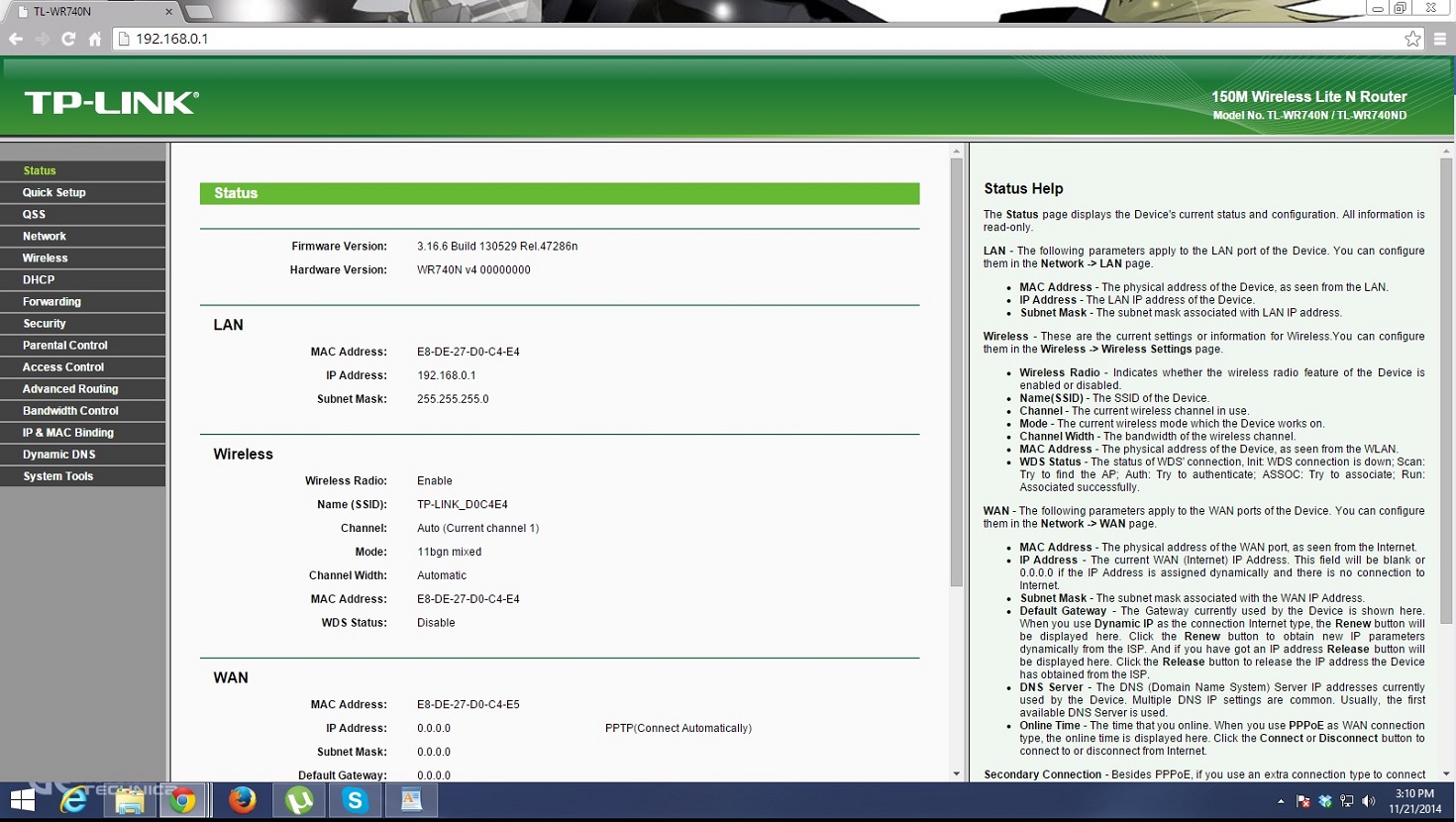 On the front page you have the status of your router like IP Addresses, Subnet Mask, SSID, Mac Address etc. I would recommend you going through the Quick Setup to easily set up your network, but since PPTP connection occur in rare cases, I would like to set it up manually.