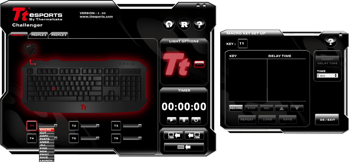 You also have the ability to create many macros, with many selections for said Macro’s. Here is what the program looks like. When you click on one of the T keys to create a profile, then click on the first of the keys that starts the macro on the pictured keyboard, which will activate the drop down menu, then make your selection. Afterwards you can make all of your customization’s from there. You can save 3 different profiles; from each of those 3 profiles you can have 6 sets of Macro’s.