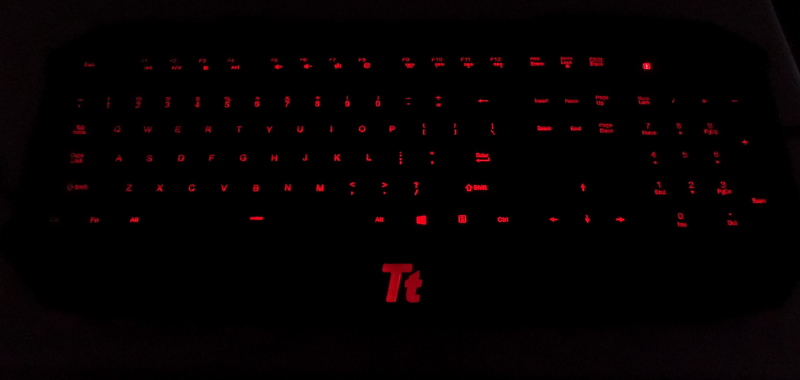 I cowered closer to my USB port and plugged it in correctly the first time, thanks to the Tt markings on the connector. As I opened my eyes the red lit keys greeted me, but that is not a test. I reopened this document diligently continued to complete this article and every single key worked, they all worked. This is attributed to 2 things, quick thinking on my part but mostly due to ThermalTakes quality product, I can’t say I would have had the same out come with some of my older keyboards, half a cup of water.
