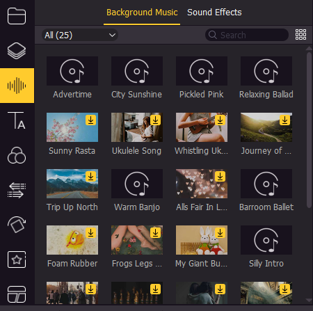 You can add background music and sound effects to your file using the Audio option in the Sidebar. There is a great collection of background music to choose from to give your video a professional vibe. There are also a variety of sound effects available, such as explosions, smash glass, tv static, and more, that you may use in your video. To include them in the video, drag & drop them onto the timeline.