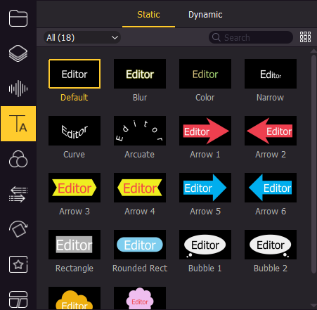 The Text tool allows you to add text to the video. The text can either be static or dynamic(animated). Drag and drop the text to the timeline and under the edit window, make changes to the text accordingly.
