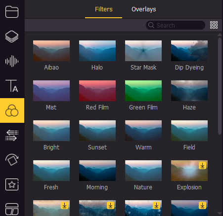 The Filter tab allows you to add some interesting filters and overlays to the video. When used in appropriate situations, these filters can completely change the look and feel of a video.