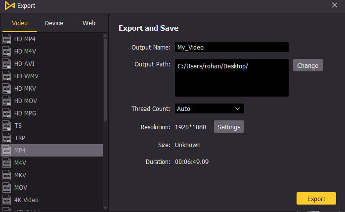 After you’ve completed editing the video, the final step is to export/render it. To export it, click on the Export icon right next to the toolbar. Select the video format, output path, resolution, and click on Export.