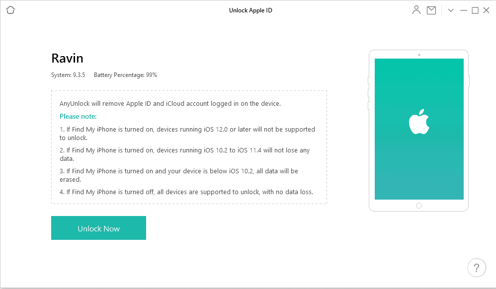 Step 1: Click on Unlock Apple ID. AnyUnlock will then ask you to connect your iOS device to your computer. Once it is connected, you can see your device name along with the iOS version and the battery percentage.