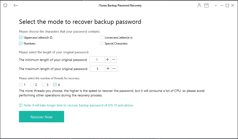 Step 2: AnyUnlock will ask you to select the mode to recover the backup password. If you have a basic hint of what your password might have been, you can specify it. Then select the number of threads for recovery. The higher the thread count, the faster the recovery will be.