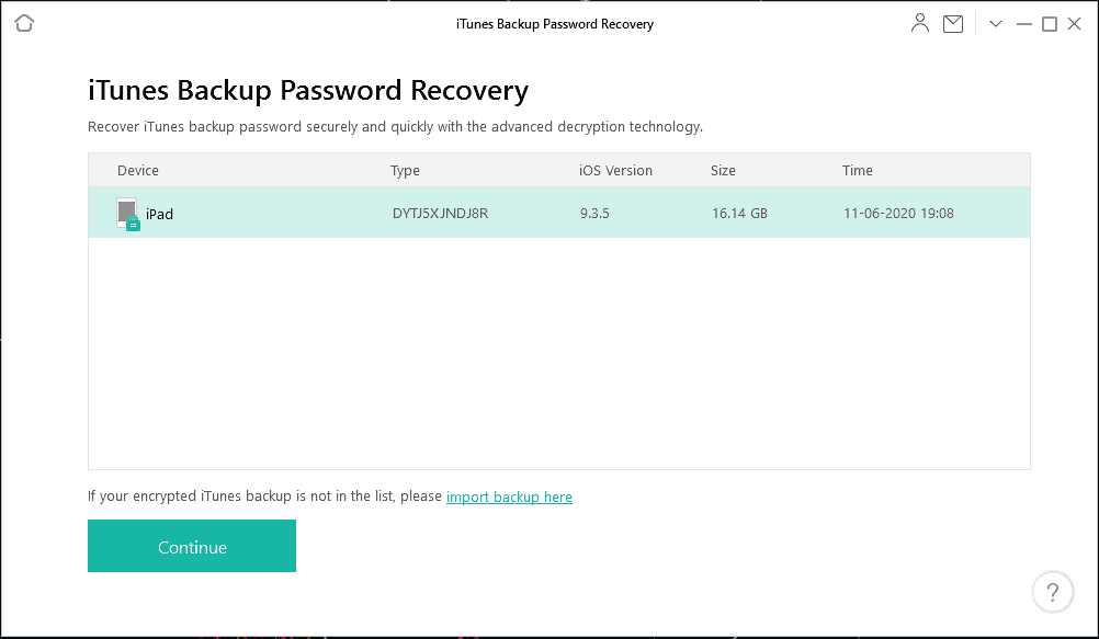 Step 1: Click on iTunes Backup Recovery. If there’s a backup available on your computer, AnyUnlock will automatically list it. Select the backup and click on Continue.