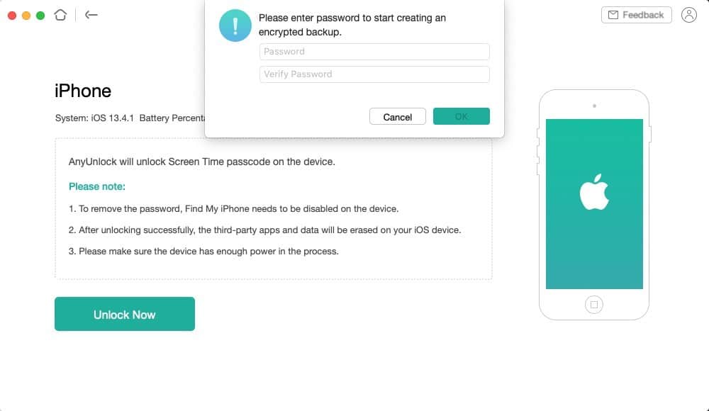 Step 2: AnyUnlock requires to create an encrypted backup from which it will recover the passcode. Set a password for the encrypted backup and click on OK.