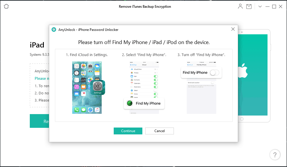Step 2: If Find My iPhone is enabled, AnyUnlock will ask you to temporarily turn it off. Once that is done, click on Continue.