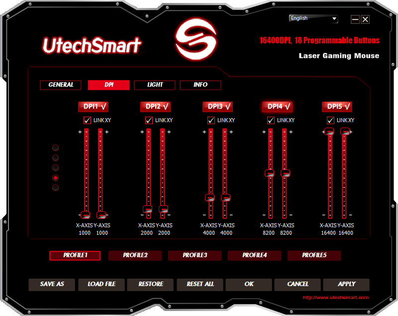 This page allows you to adjust your DPI and save them per profiles, for a maximum of 5 DPI profile settings. These settings are not static settings, you can actually lower and raise the slider bars to get the exact DPI level you prefer, a nice setting.