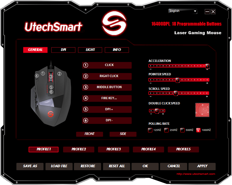 On the main page, you can change all of the mouse buttons (Front and Side), Acceleration, Pointer Speed, Scroll Speed, Double Click Speed, Polling Rate and accessing your profiles.