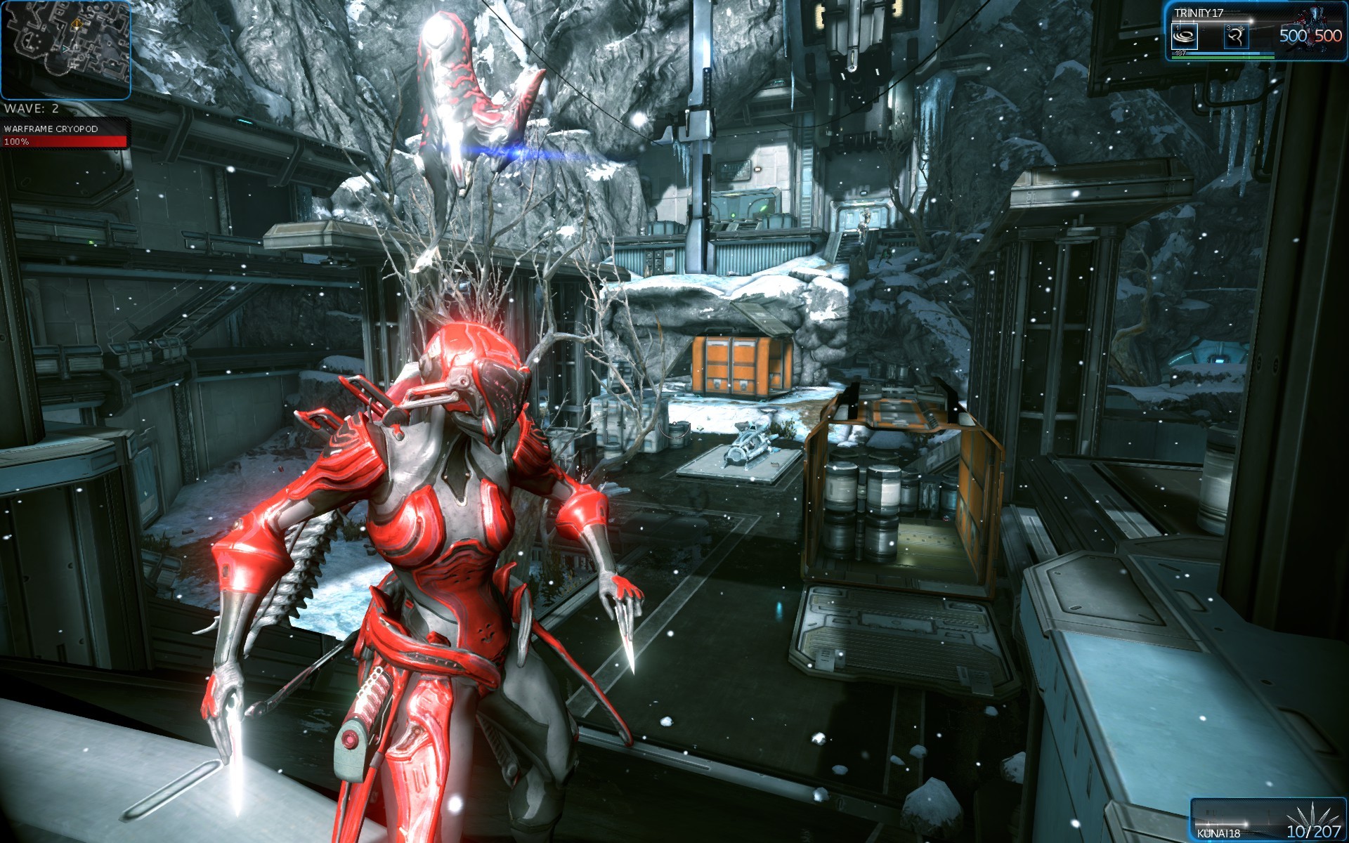 For those unfamiliar with Warframe, it’s a 3rd person crazy sc-fi shooter, where up to four players can work together to complete missions and kill enemies with arrays of weapons to use! You play as a Tenno, who have awoke to find themselves in a war with a race of militarized human clones called the Grineer. Players wear a battlesuit which is called a warframe. The warframes each have different abilities along with 3 weapons, primary, secondary and a melee weapon such as a longsword.
