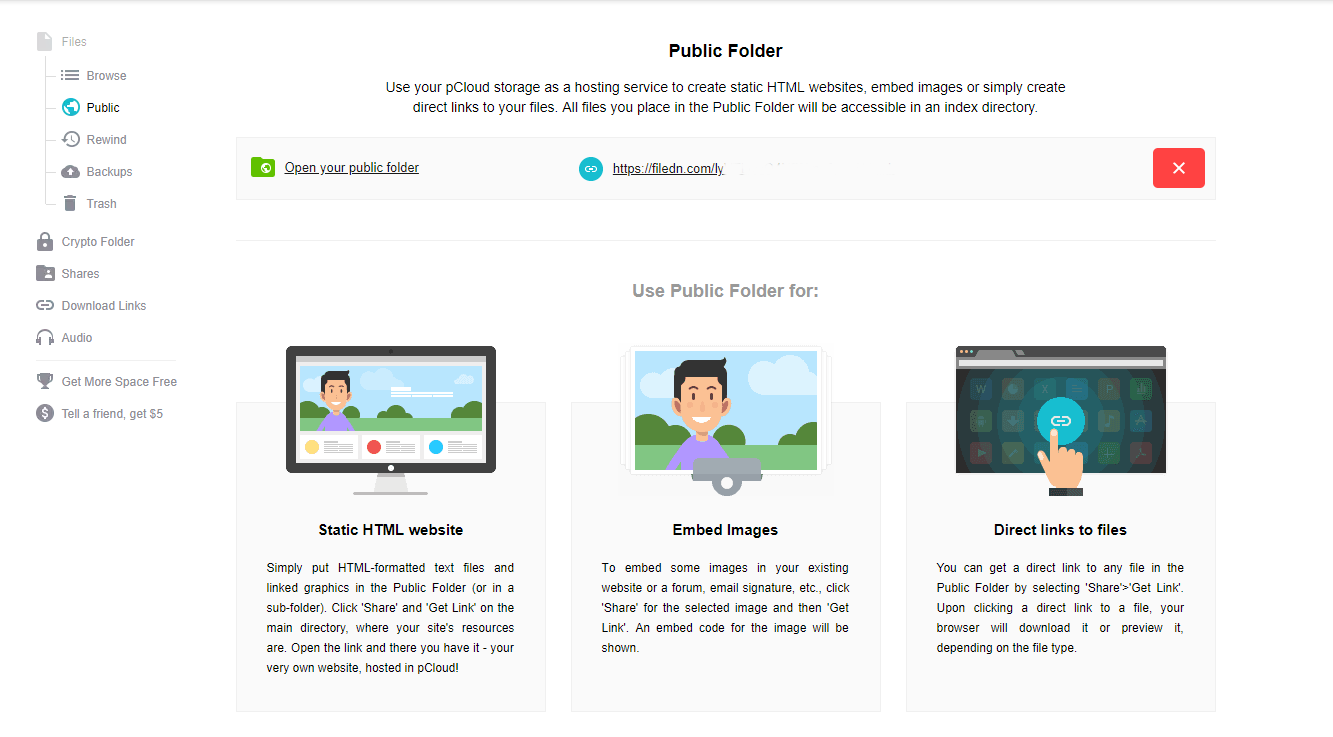 The public Folder is a folder which makes any files present in the folder accessible to those with the link to the folder. To create a Public Folder, open pCloud through the browser and under the Public tab, click on open your public folder. Here you can add the files that you want to share with your friends and family. Anyone with access to the link can view and download the files from the public folder. Apart from using the Public Folder for sharing files, you can also use it to create a static HTML website which will be hosted on pCloud.