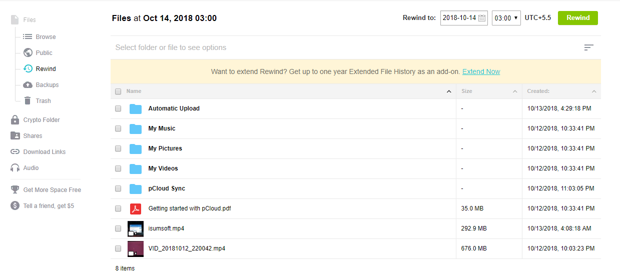 Rewind is yet another useful feature that pCloud offers. Rewind lets you recover older versions of your saved files. Say you are working on some files that are saved in your pCloud drive or are synced with pCloud. You have been working with it for a couple of days and want to recover the 3 days older version of the file that you are currently working on. With the Rewind feature, you can restore the 3 days older file with ease. This can also be done using the File Revision option, but the Rewind feature lets you restore multiple files together. You can restore versions up to 30 days in the past and can even extend it up to 1 year by paying just $40.