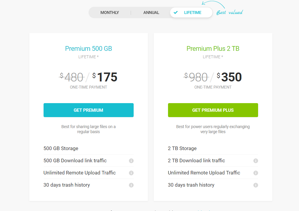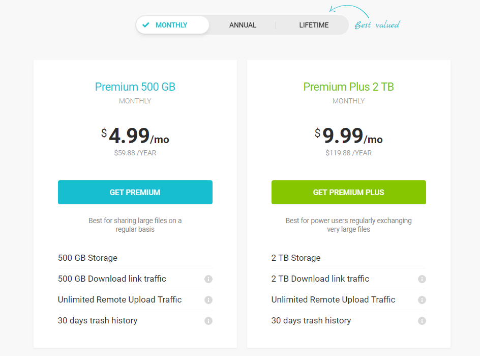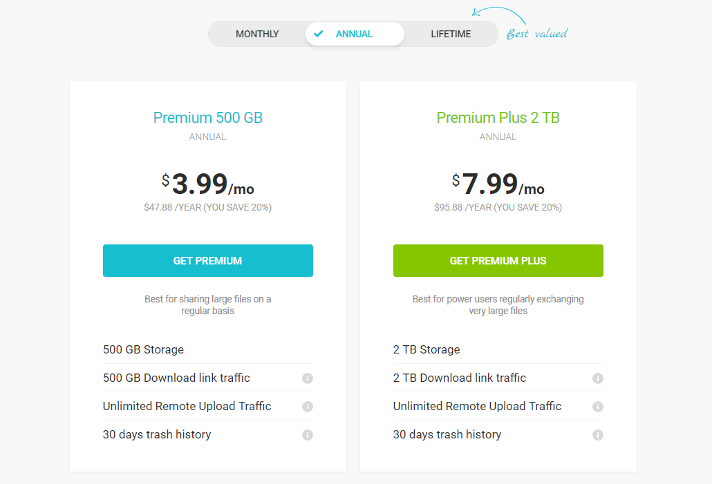 Apart from the 10GB of free storage, pCloud provides two different storage plans. The storage plan is limited to just 2 sizes. You can choose to get a 500GB plan or a 2TB plan. Payment can be done on a monthly, annual and lifetime basis. A monthly plan will cost you $4.99 per month for a 500GB storage, while the 2TB will cost you only $9.99 per month.