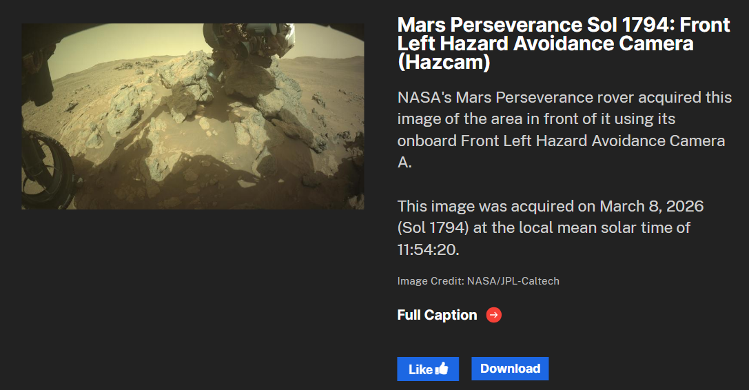 For example, this is a very recent image taken by the Perseverance rover on March 8, 2026. On NASA’s official website, you can see all the photos both robots are taking, so it is common to find images from the same day.