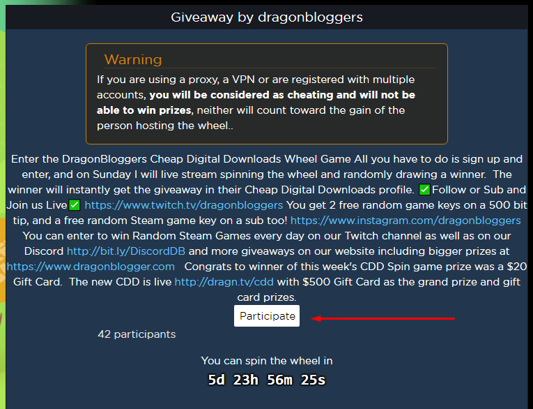 The way it works is you just visit our Wheel Game at Cheap Digital Download, which the URL changes each week so you have to use the shortlink http://dragn.tv/cdd specifically, don’t bookmark the link it ends up at as once the giveaway ends that becomes a historical replay of the previous giveaway.  Once you visit the link sign up or sign in with your Twitch account (or create an account) and click the participate button.  You are eligible to enter even if you get a popup asking you to redirect to AllKeyShop or another variation fo their store from another country, you do not have to be in the USA to enter and win, but you cannot use a VPN or Proxy and try to enter, that will disqualify you and they have a very specific anti-cheat system.