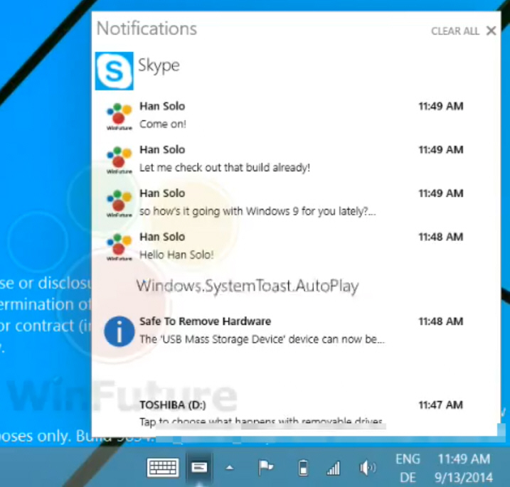 New notification center is also Windows 10, resembling the Notifications panel from Windows Phone 8. It will manage all your notification in one place and will also include some frequently accessed toggles.