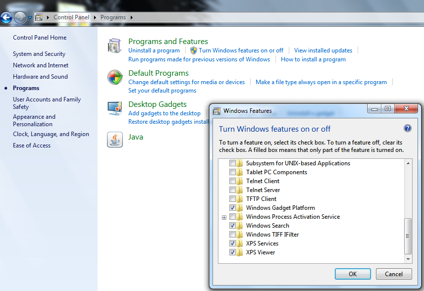 - Under Programs and Features, click on “Turn Windows Features On/Off”