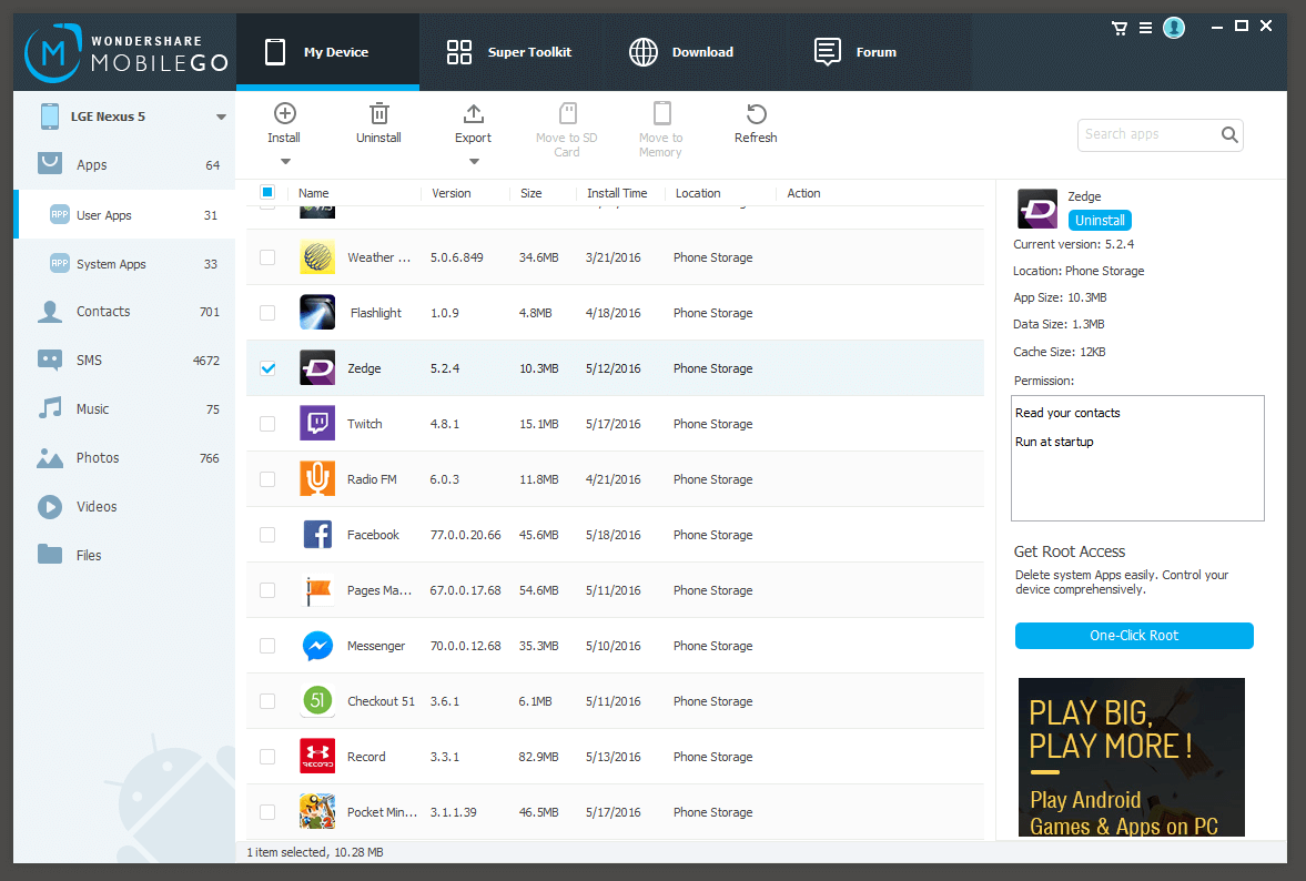 Obviously with being a tablet, I don’t have as much in the way of SMS or phone functions to sync and test, but particularly was curious about the app management and other functions. So the first thing I did was see if Wondershare MobileGo can uninstall and cleanup some apps from my Kingpad V10 Android Tablet.