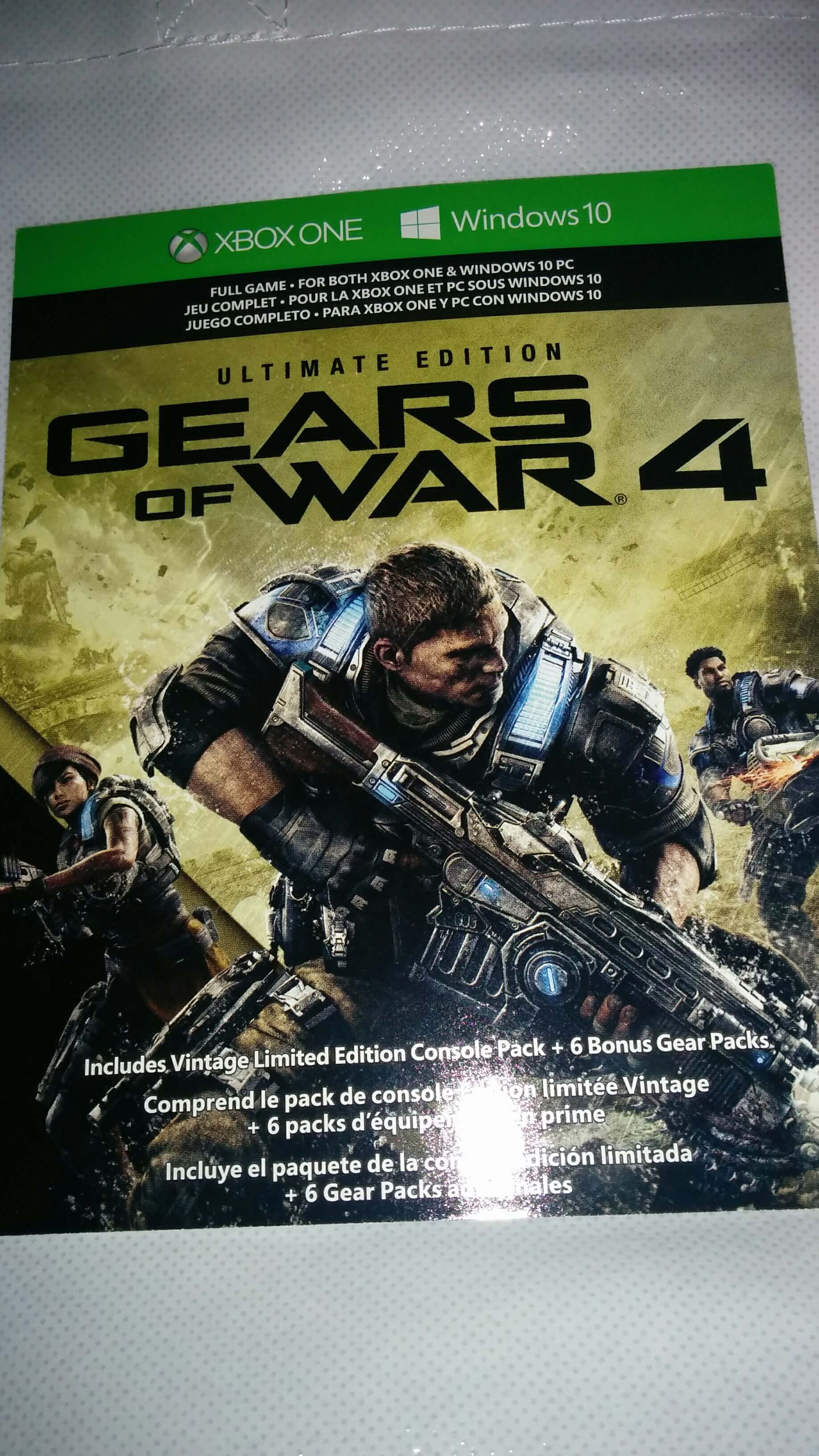 Included as well is a digital code for Gears of War 4. People with this will get access to the game 4 days before the actual game is released. Also, comes with exclusive Vintage VIP Pack, featuring Vintage JD, the Vintage Gnasher and Dropshot weapon skins, Vintage JD Emblem and Vintage JD Bounty for extra XP. As well as